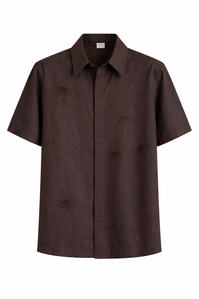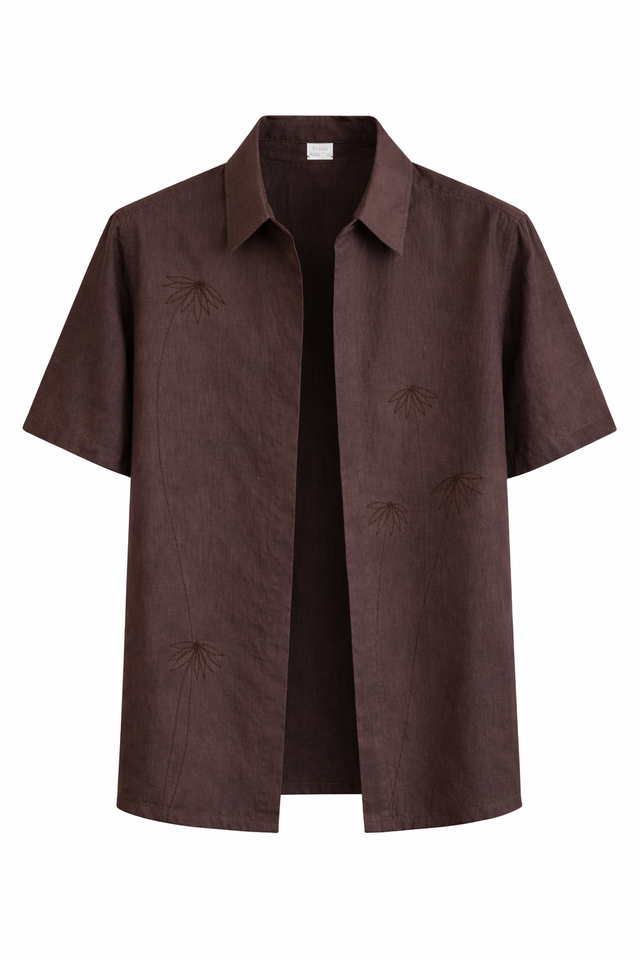Camisa masculina confeccionada y bordada a mano en algodón orgánico. Diseño relajado. Cómoda y versátil.